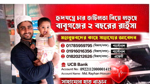 বাবুগঞ্জে ২ বছরের শিশুর হৃদযন্ত্রে চার জটিলতা, অপারেশনে প্রয়োজন ১০ লাখ টাকা বাবুগঞ্জ (বরিশাল) প্রতিনিধিঃ বরিশালের বাবুগঞ্জ উপজেলার রহমতপুর ইউনিয়নের পূর্ব ক্ষদ্রকাঠী গ্রামের দুই বছরের রাইসা হাওলাদার জটিল হৃদরোগে আক্রান্ত। শিশুটির হৃদযন্ত্রে চারটি গুরুতর জটিলতা…