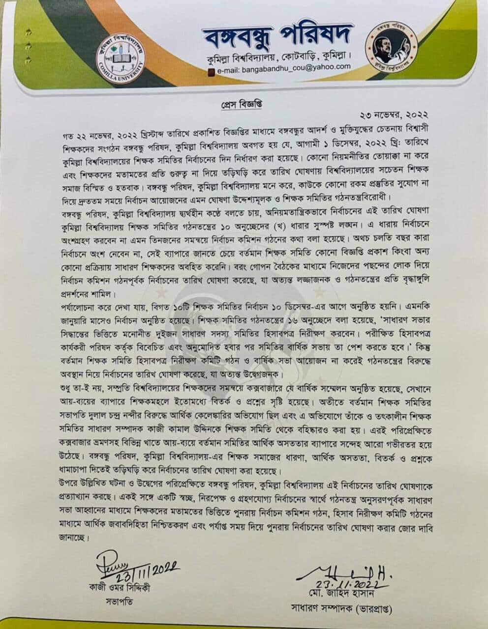 প্রেস বিজ্ঞপ্তিতে উল্লেখ করা হয়, কোনো নিয়মনীতির তোয়াক্কা না করে এবং শিক্ষকদের মতামতের প্রতি গুরুত্ব না দিয়ে তড়িঘড়ি করে তারিখ ঘোষণায় বিশ্ববিদ্যালয়ের সচেতন শিক্ষক সমাজ বিস্মিত ও হতবাক। বঙ্গবন্ধু পরিষদ, কুমিল্লা বিশ্ববিদ্যালয় মনে করে, কাউকে কোনো রকম প্রস্তুতির সুযোগ না দিয়ে দ্রুততম সময়ে নির্বাচন আয়োজনের এমন ঘোষণা উদ্দেশ্যমূলক ও শিক্ষক সমিতির গঠনতন্ত্রবিরোধী।