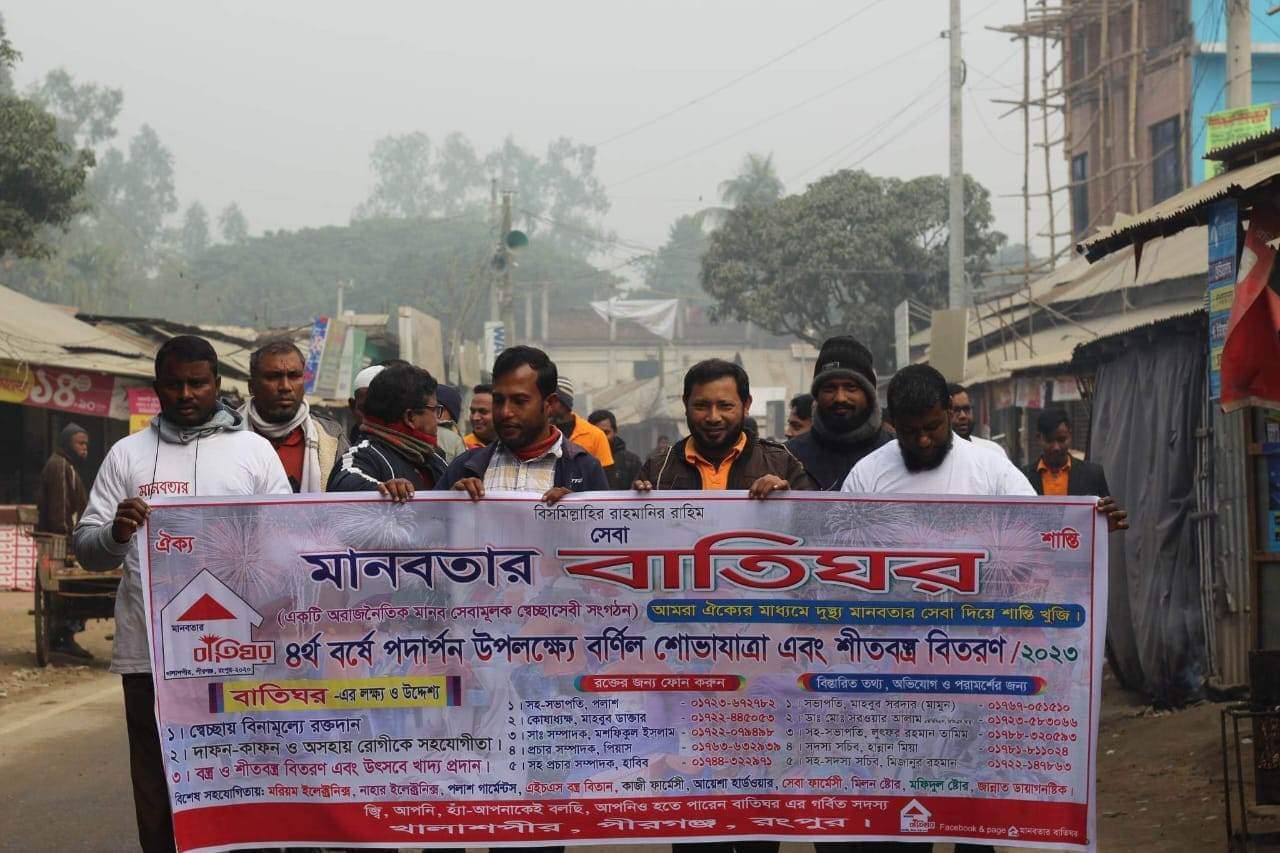অরাজনৈতিক স্বেচ্ছাসেবী সংগঠন মানবতার বাতিঘরের চতুর্থ বর্ষে পদার্পণ উপলক্ষে বর্ণিল শোভাযাত্রা ও অসহায় শীতার্ত মানুষের মাঝে শীতবস্ত্র কম্বল বিতরণ এবং রক্তদাতাদেরকে সম্মাননা দেওয়া হয়েছে। আজ শনিবার খালাশপীর মা ও শিশু হাসপাতালে কম্বল বিতরণ করা হয়। এর আগে সংগঠনের সদস্যরা স্বেচ্ছায় রক্ত দান এবং তাদের প্রত্যেককে ফুল ও একটি মগ দিয়ে শুভেচ্ছা জানানো হয়। এ সময় উপস্থিত ছিলেন সংগঠনের সভাপতি মাহবুব সরদার মামুন, সহ-সভাপতি লুৎফর রহমান তামিম, সাধারণ সম্পাদক শফিকুল ইসলাম, প্রচার সম্পাদক মাসুদ রানা, সদস্য সচিব হান্নান মিয়াসহ সদস্য সচিব মিজানুর রহমান ও বিপ্লব সরকার। কোষাধ্যক্ষ ডাক্তার মাহবুবার রহমানসহ সংগঠনের সকল সদস্যবৃন্দ গত তিন বছর ধরে উপজেলায় বিভিন্ন সামাজিক উন্নয়নে ভূমিকা পালন করে আসছে মানবতার বাতিঘর সংগঠনটি। আমরা ঐক্যের মাধ্যমে দুষ্ট মানবতার সেবা দিয়ে শান্তি খুঁজি। সংগঠনের লক্ষ্য উদ্দেশ্য হল তৃণমূলে রক্তদান দাফন কাফন ও অসহায় রোগীদের সহযোগিতা শীতকালে দুস্থদের মাঝে শ্বেত বস্ত্র বিতরণ ঈদে খাদ্য সামগ্রী বিতরণ সহ সামাজিক উন্নয়নে ব্যাপক অবদান রাখছে।