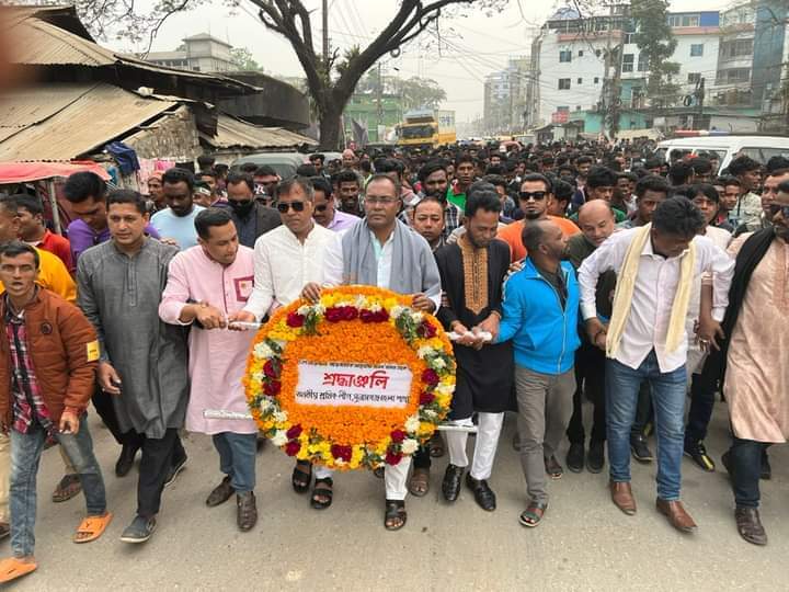 মঙ্গলবার (২১ ফেব্রুয়ারি) সকাল ১০টার পর পৌর শহরের কেন্দ্রীয় শহিদ মিনারে সুনামগঞ্জ ১ আসনের নৌকার মনোনয়ন প্রত্যাশী এবং জাতীয় শ্রমিকলীগ সুনামগঞ্জ জেলা শাখার সভাপতি মো: সেলিম আহমদ এর নেতৃত্বে ভাষা শহীদদের উদ্দেশ্যে পুষ্পার্ঘ্য অর্পণ করেন।