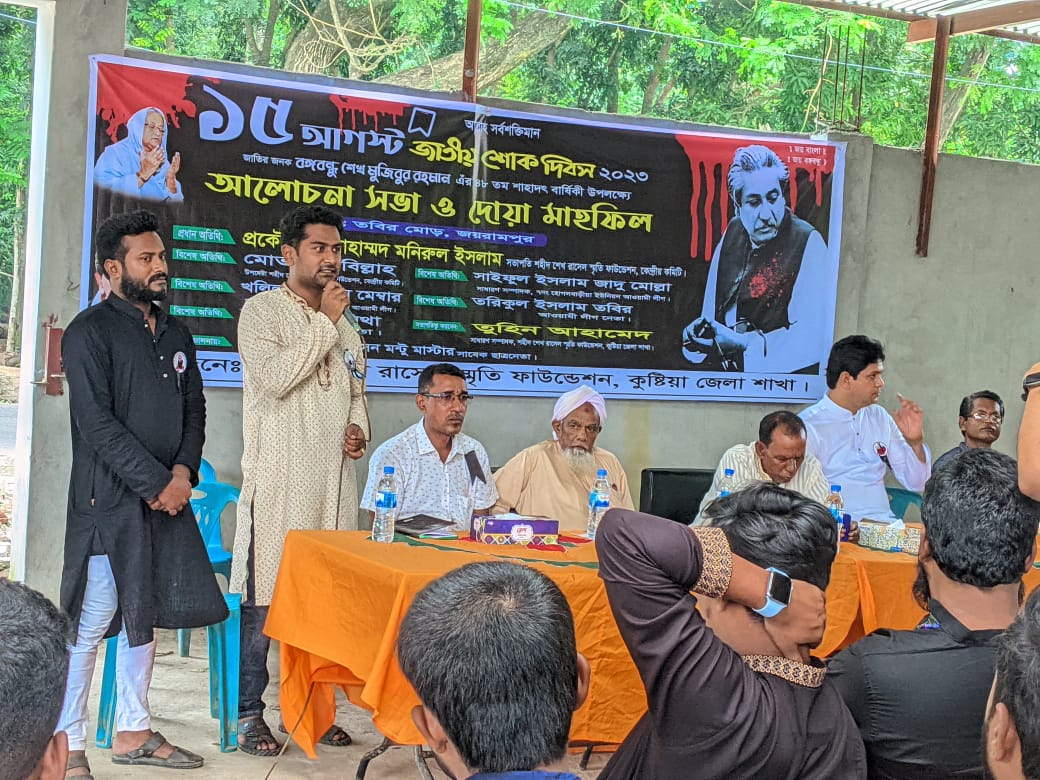 আলোচনা সভা ও দোয়া মাহাফিলে সভাপতিত্ব করেন শহীদ শেখ রাসেল স্মৃতি ফাউন্ডেশন, কুষ্টিয়া জেলা শাখার সাধারণ তুহিন আহামেদ।