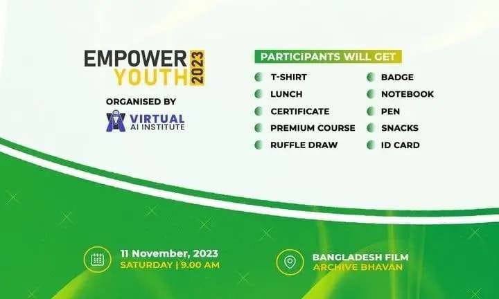 আপনার সেই পাওয়ার বা প্রতিভাকে রিয়াক্টিভ করতে এবং আগামী প্রজন্মের জন্য তৈরি হতে, টিকে থাকতে Virtual AI Institute আয়োজন করতে যাচ্ছে Empower Youth 2023। আগামী ১১ নভেম্বর ২০২৩ ইং তারিখের সকাল 9 টায় ঢাকার আগারগাঁওয়ে অবস্থিত বাংলাদেশ ফিল্ম আর্কাইভ ভবনে অনুষ্ঠিত হতে যাচ্ছে Empower Youth 2023।
