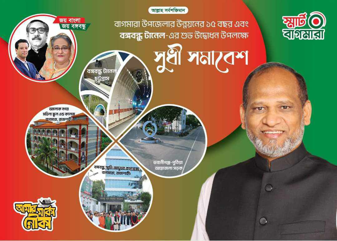 দেশজুড়ে প্রধানমন্ত্রী জননেত্রী শেখ হাসিনার নেতৃত্বে উন্নয়নের ধারাবাহিকতায় উন্নয়ন মহোৎসবের মাসে বঙ্গবন্ধু টানেল এর শুভ উদ্বোধন, বাগমারা উপজেলার উন্নয়নের ১৫ বছর এবং ভবিষ্যৎ স্মার্ট বাগমারা গড়ার পরিকল্পনা নিয়ে অনুষ্ঠিত হবে সুধী সমাবেশ।
