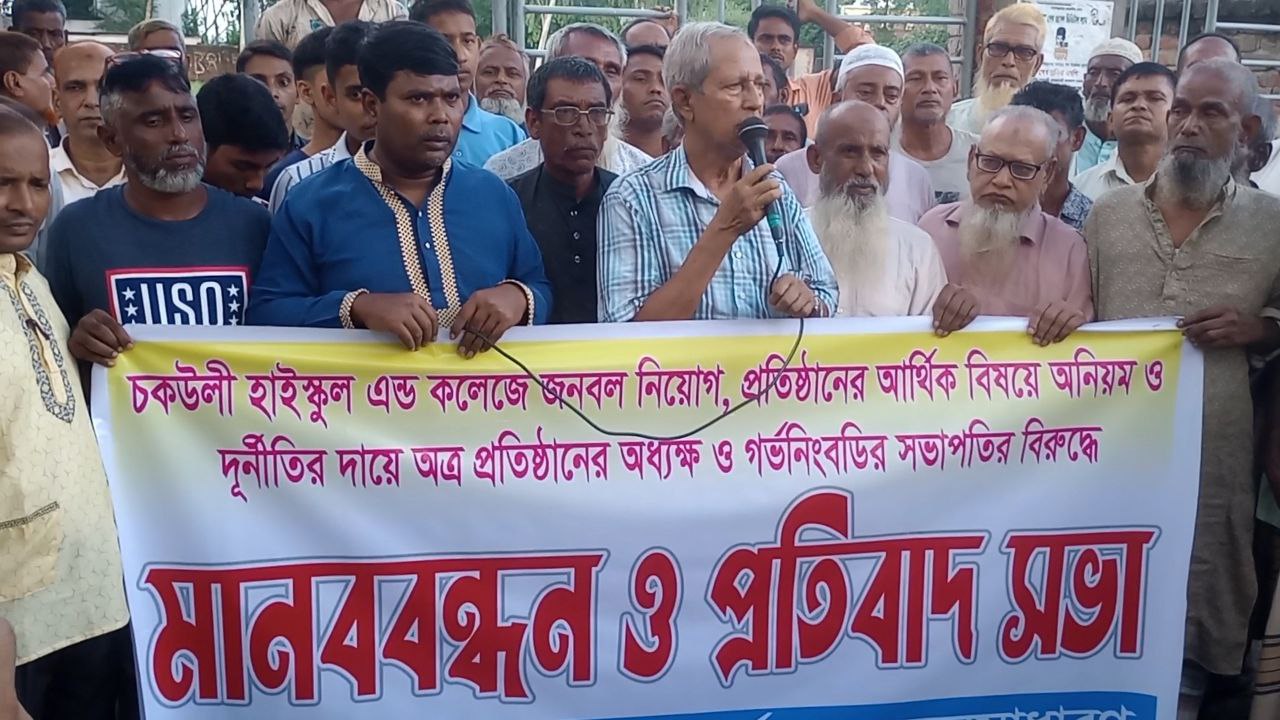 নওগাঁ মান্দা উপজেলার চকউলী বহুমুখী উচ্চ বিদ্যালয় এন্ড কলেজের প্রধান শিক্ষক ও ম্যানেজিং কমিটির সভাপতির বিরুদ্ধে নানান দুর্নীতি, অনিয়ম, স্বজনপ্রীতি, স্বেচ্ছাচারিতা এবং অর্ধ কোটি টাকার নিয়োগ বাণিজ্য বন্ধের দাবিতে মানববন্ধন ও প্রতিবাদ সভা অনুষ্ঠিত হয়েছে।