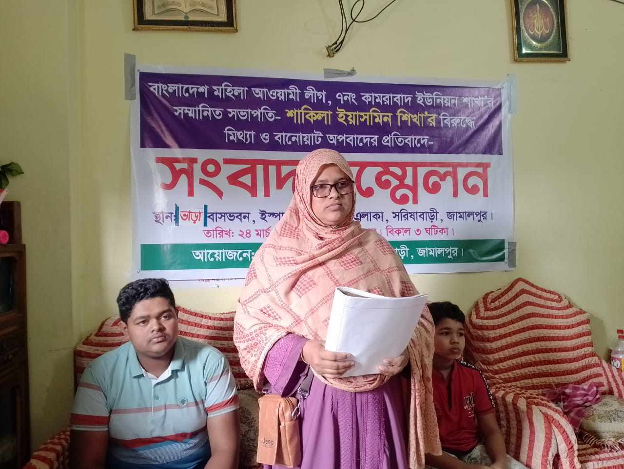 জামালপুরের সরিষাবাড়িতে বাংলাদেশ আওয়ামী লীগ উপজেলার ৭ নং কামরাবাদ ইউনিয়ন শাখার সভাপতি শাকিলা ইয়াসমিন শিখার বিরুদ্ধে মিথ্যা, বানোয়াট,মামলা ও অপবাদের প্রতিবাদে সংবাদ সম্মেলন অনূষ্ঠিত হয়। গতকাল রবিবার বিকালে পৌর সভার ইস্পাহানী এলাকায় একটি ভাড়াটিয়া বাসায় আয়োজিত সংবাদ সম্মেলনে ভুক্তভোগী শাকিলা ইয়াসমিন শিখা লিখিত বক্তব্যে তিনি এই অভিযোগ করেন।