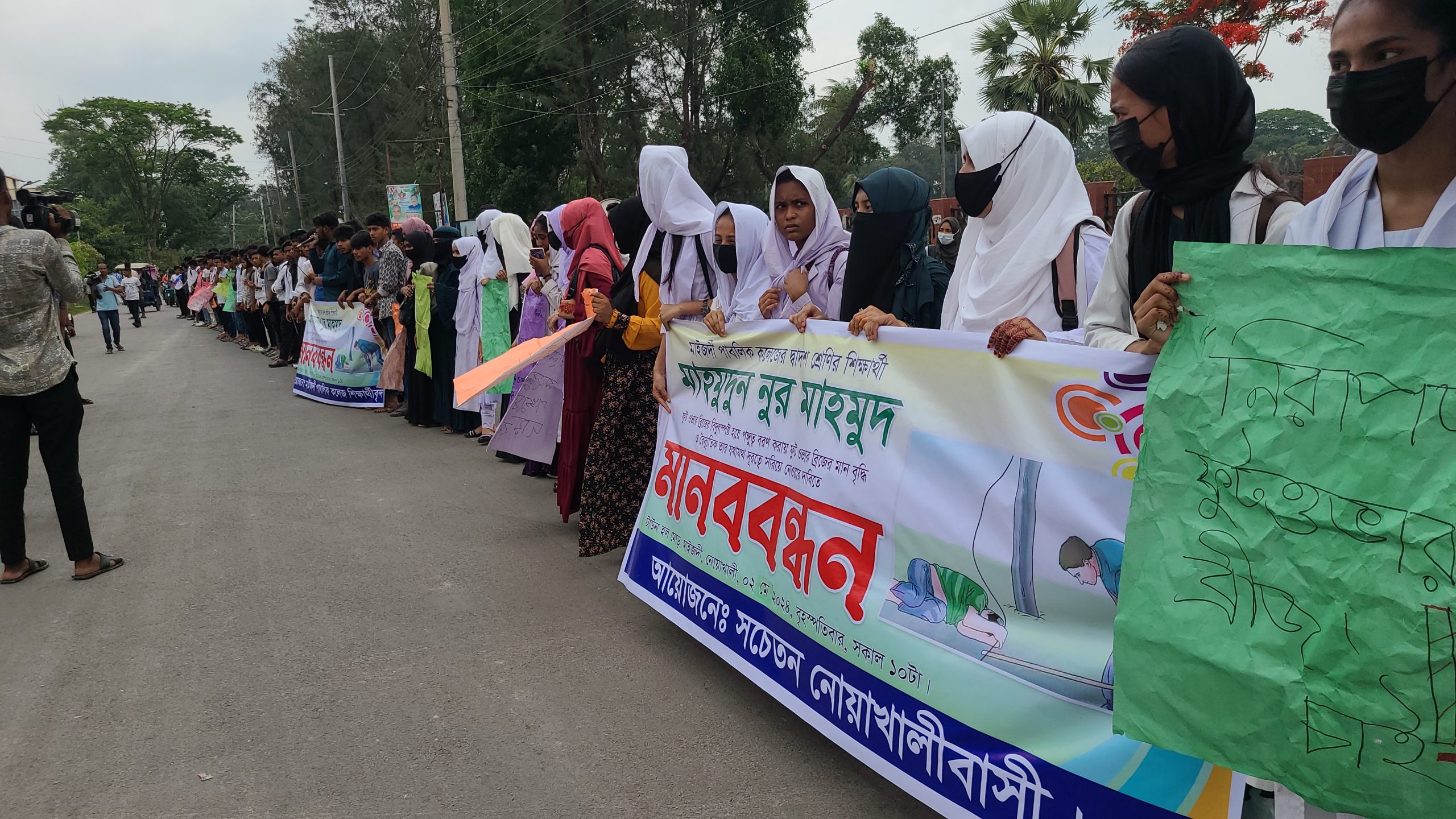 বৃহস্পতিবার সকালে টাউন হল মোড়, ও জেলা প্রশাসক কার্যালয়ের সামনে মাইজদী পাবলিক কলেজ শিক্ষার্থীবৃন্দ ও সচেতন নোয়াখালীবাসী আয়োজনে এই মানববন্ধন অনুষ্ঠিত হয়।