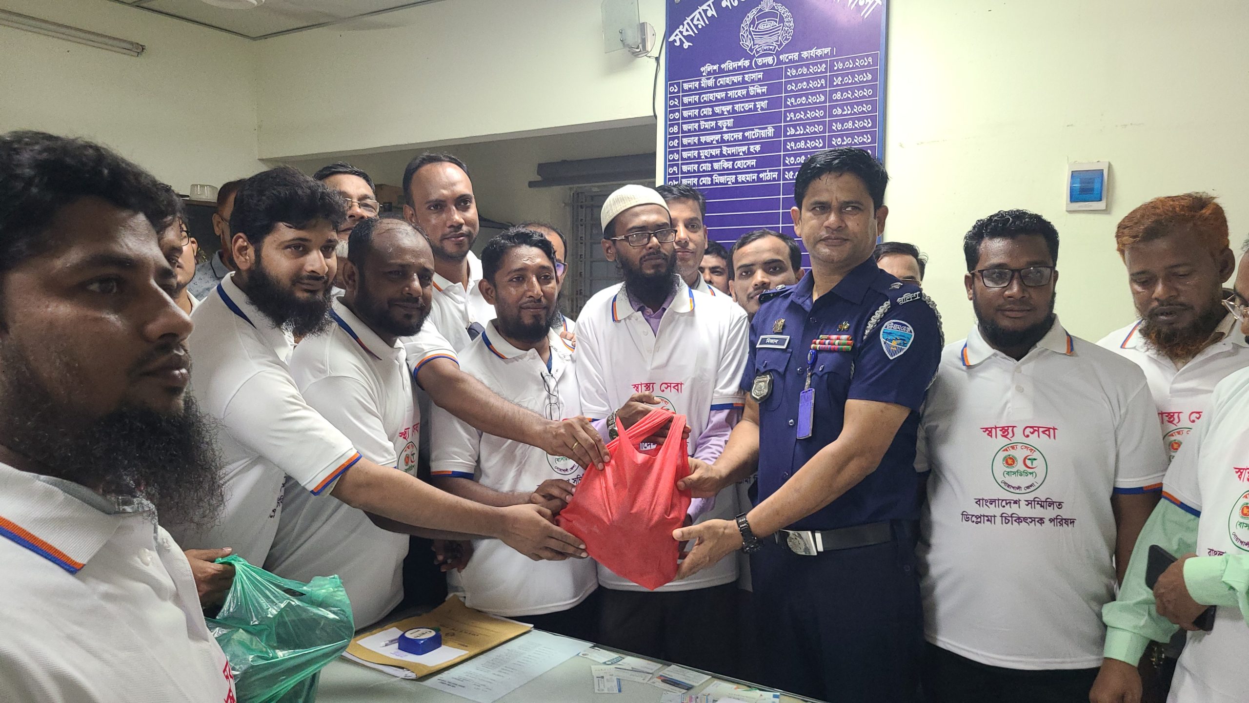 মডেল থানার পক্ষ থেকে খাদ্য পানি মডেল থানার ওসি তদন্ত মিজানুর রহমান পাঠান সংগঠনের সেচ্ছাসেবীদের থেকে নেয়।এসময় উপস্থিত ছিলেন বাংলাদেশ সম্মিলিত ডিপ্লোমা চিকিৎসক পরিষদের নোয়াখালী জেলা সভাপতি ডাক্তার হাবিবুর রহমান সুমন, সেক্রেটারি মামুন মিয়া মাসুদ, সাংগঠনিক সম্পাদক আকবর হোসেন সম্রাট, কোষাধক্ষ্য বশির আহমেদ জুয়েল, উপদেষ্টা মন্ডলী সভাপতি আহসান উল্ল্যাহ হাসান, সহ-সভাপতি নন্দন চন্দ্র শীল সহ আরো অনেকে।
