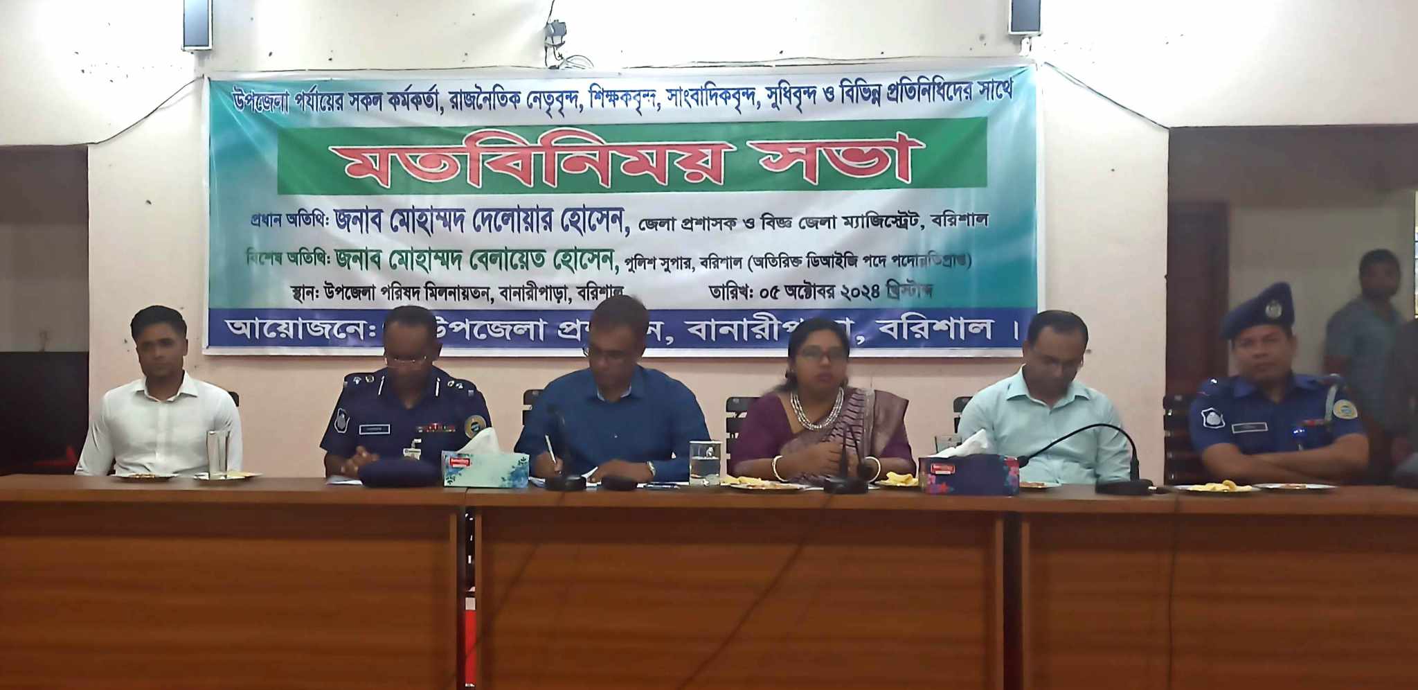 বরিশালের বানারীপাড়ায় উপজেলা প্রশাসনের আয়োজনে উপজেলা পর্যায়ের সকল কর্মকর্তা রাজনৈতিক নেতৃবৃন্দ, শিক্ষকবৃন্দ, সাংবাদিকবৃন্দ, হিন্দু সম্প্রদায়ের বিভিন্ন সংগঠনের প্রধান, সুধীবৃন্দ ও বিভিন্ন প্রতিনিধিদের সাথে মতবিনিময় সভা অনুষ্ঠিত হয়েছে। ৫ সেপ্টেম্বর শনিবার দুপুর ২ টা ৩০ মিনিটের সময় উপজেলা অডিটেরিয়ামে মতবিনিময় সভায় বানারীপাড়া উপজেলা নির্বাহী কর্মকর্তা ডা: অন্তরা হালদারের সভাপতিত্বে অনুষ্ঠিতব্য মতবিনিময় সভায় প্রধান অতিথি ছিলেন বরিশাল জেলা প্রশাসক ও বিজ্ঞ জেলা ম্যাজিস্ট্রেট জনাব মোহাম্মদ দেলোয়ার হোসেন। সহকারী কমিশনার (ভূমি) মুসতাহসিন তাসনিম রহমান অনিন্দ্রর সঞ্চালনায় এ সময় বিশেষ অতিথি ছিলেন বরিশাল জেলা পুলিশ সুপার মোহাম্মদ বেলায়েত হোসেন, ম্যাজিস্ট্রেট রবিউল হাসান, থানা ভারপ্রাপ্ত কর্মকর্তা মো: মুমিন উদ্দীন প্রমুখ।এ সময় অন্যান্যদের মধ্যে বক্তব্য রাখেন বানারীপাড়া উপজেলা বিএনপির আহবায়ক মোঃ শাহে আলম মিয়া, সদস্য সচিব মোহাম্মদ রিয়াজ আহমেদ মৃধা, বানারীপাড়া উপজেলা জামায়াতে ইসলামীর সেক্রেটারি হাফেজ মোকাম্মেল হোসেন মোজাম্মেল, বানারীপাড়া উপজেলা বিএনপির সাবেক সাধারন সম্পাদক গোলাম মাহমুদ মাহাবুব মাস্টার, সাংবাদিক সাইদুল ইসলাম, বানারীপাড়া উপজেলা পূজা উদযাপন পরিষদে দেবাশীষ দাস প্রমুখ। এ সময় জেলা প্রশাসক ও এসপি আসন্ন পূজাকে কেন্দ্র করে কোন পূজা মন্ডপে কোন ধরনের অপ্রীতিকর ঘটনা না ঘটে সেদিকে সবাইকে সজাগ বৃষ্টি রাখার আহ্বান জানিয়েছেন। প্রতিটি পূজা মন্ডপে যাতে সুন্দর সুষ্ঠুভাবে পূজা অনুষ্ঠিত হতে পারে তার জন্য সবার কাছে সহযোগিতা এবং এবং প্রতিদিন প্রতিটি পূজা মন্ডপে পালাবদল করে পাঁচজন করে পাহারায় থাকতে হবে বলে সবাইকে জানান।