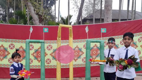 নাটোরের বড়াইগ্রাম এ কলার গাছে তৈরি শহিদ মিনারে ফুল দিল শিক্ষার্থীরা